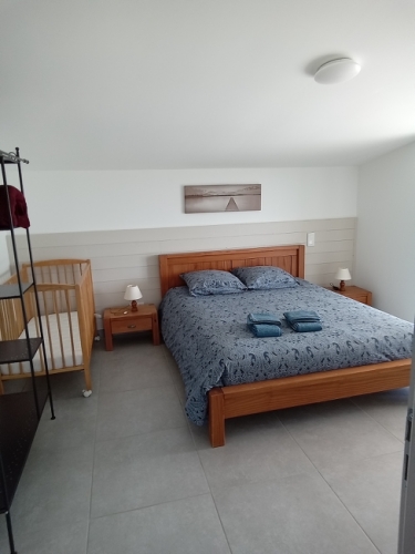 Cette chambre est équipée d'un lit en 160 cm ainsi que d'un lit bébé. Elle a un accès sur la terrasse.